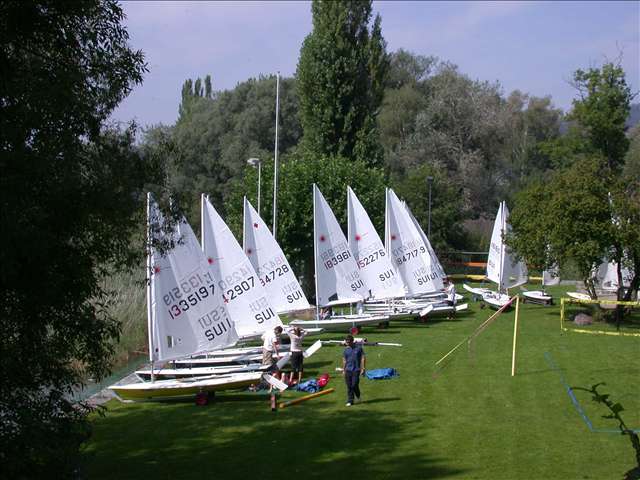 Le père de Valentin nous a amené samedi matin, Jana, Yann, Valentin et moi. Nous arrivons là-bas mais dès que nous apercevons le lac, nous pouvons voir avec tristesse un lac complètement plat comme un miroir. Cela ne va malheureusement pas s’améliorer durant le weekend puisqu’il y aura aucune manche ni le samedi ni le dimanche. Dommage car nous étions 25 laser Radial ce qui représente déjà une jolie flotte au niveau Suisse.