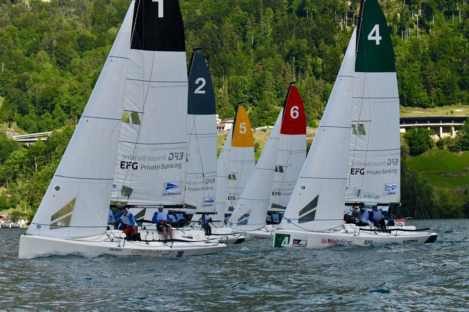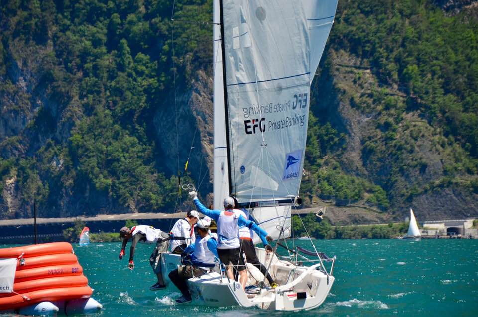 Après le résultat de l’Act1 à Brissago, l’équipe de la Bordée de Tribord – La Neuveville, cette fois formée par Timon Kausche (Skipper), Olivier Bessire (Régleur Spi), Laurent Forrer (No1) & Lorenz Kausche (Régleur foc & tactique), était un peu plus nerveuse. La pression était bien présente avec une constellation complètement différente par rapport à l’événement précédent ; du vent thermique entre 2-4 bft et du soleil annoncé pour tout le weekend.
